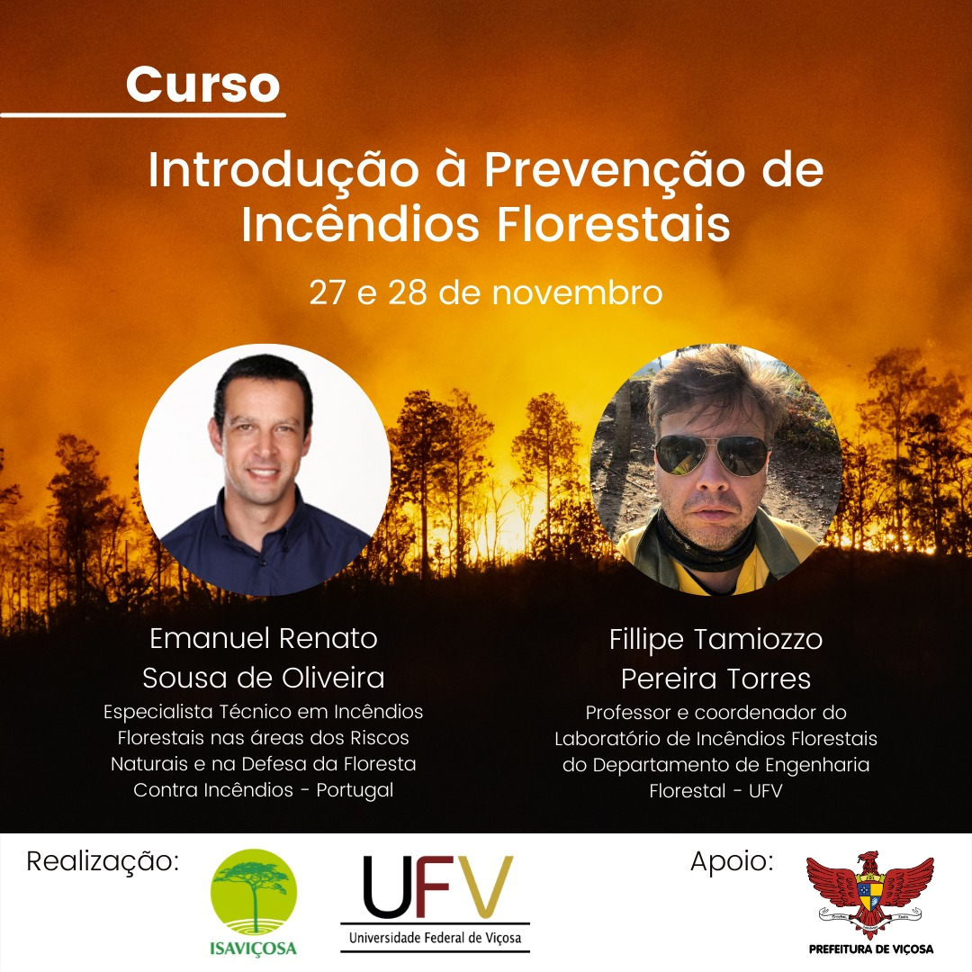 Nos dias 27 e 28 de novembro, foi realizado o curso Introdução à Prevenção de Incêndios Florestais, ministrado por Emanuel Renato Sousa de Oliveira, consultor independente nas áreas dos Riscos Naturais e na Defesa da Floresta Contra Incêndios em Portugal, e por Fillipe Tamiozzo Pereira Torres, professor e coordenador do Laboratório de Incêndios Florestais do Departamento de Engenharia Florestal da Universidade Federal de Viçosa (UFV).